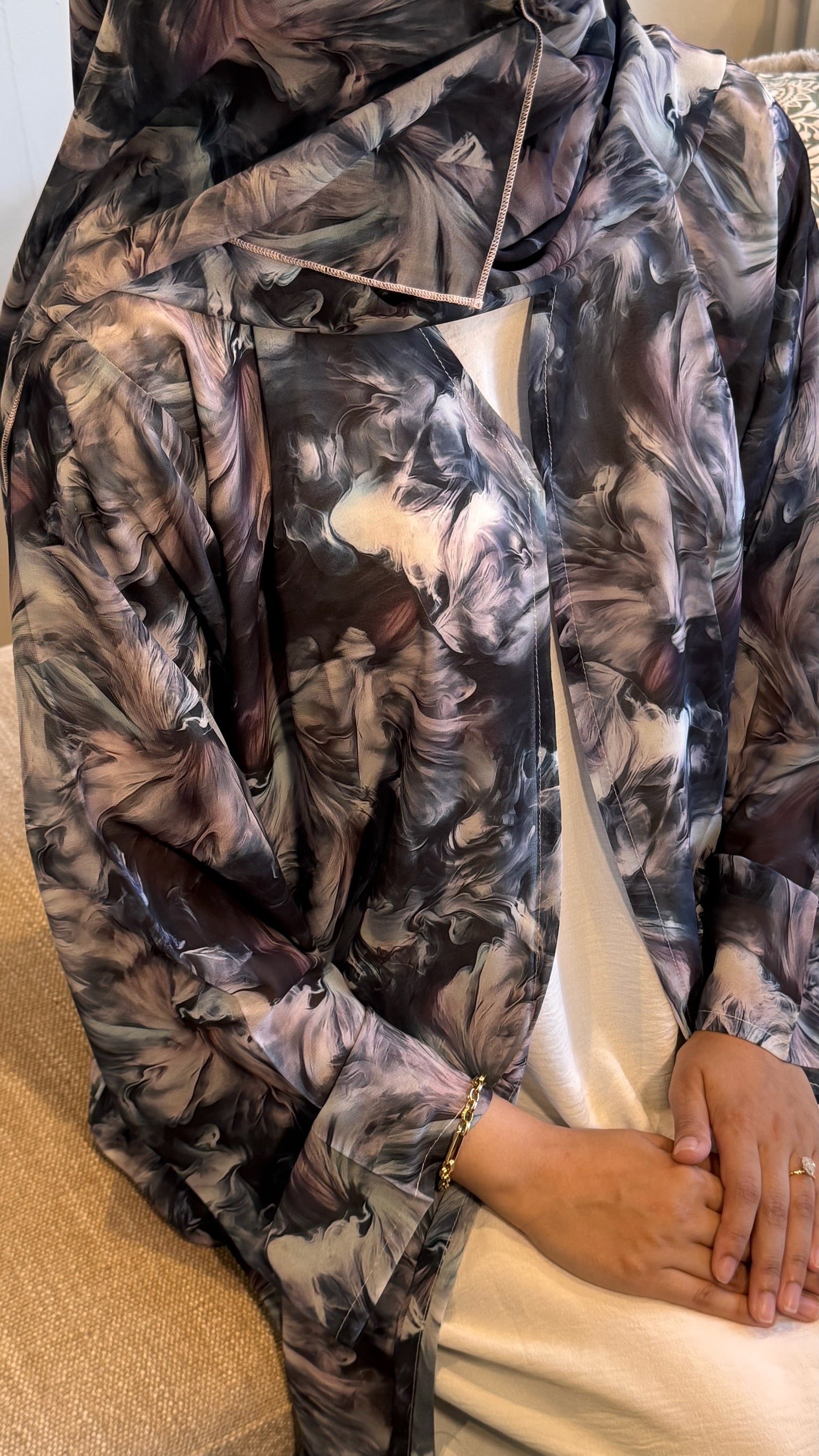The Sama Abaya Set includes abaya and matching hijab. A chiffon design in calming blue and white floral tones elegant, modest, and timeless.
